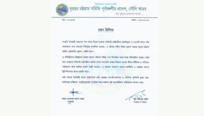 বিজ্ঞপ্তিতে উল্লেখ করা হয়- ‘‘সম্প্রতি ইসলামী ব্যাংকের পক্ষ থেকে বিপুল সংখ্যক কর্মকর্তা-কর্মচারীকে চাকরিচ্যুত ও ওএসডি করার খবর গণমাধ্যমে আর সোস্যাল মিডিয়ায় প্রকাশিত হয়েছে। এ ঘটনায় গভীর উদ্বেগ প্রকাশ করছে বৃহত্তর চট্টগ্রাম সমিতি পূর্বাঞ্চলীয় প্রদেশ, সৌদি আরব।