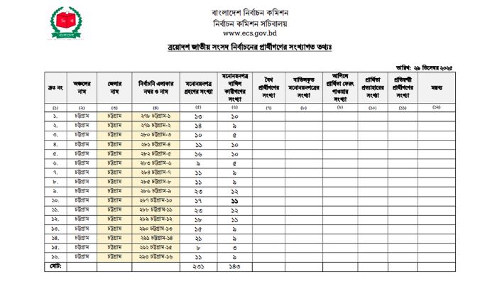 এছাড়া, চট্টগ্রাম-৯ (কোতোয়ালী) আসনে ২৩ জনের বিপরীতে ১২ জন, চট্টগ্রাম-১০ (পাহাড়তলী) আসনে ১৭ প্রার্থীর বিপরীতে ১১ প্রার্থী, চট্টগ্রাম-১১ (বন্দর) আসনে ২৩ প্রার্থীর বিপরীতে ১৩ প্রার্থী, চট্টগ্রাম-১২ (পটিয়া) আসনে ১৮ প্রার্থীর বিপরীতে ১১ প্রার্থী, চট্টগ্রাম-১৩ (আনোয়ারা) আসনে ১৫ জনের বিপরীতে ৯ জন, চট্টগ্রাম-১৪ (চন্দনাইশ) আসনে ২১ জনের বিপরীতে ৯ জন, চট্টগ্রাম-১৫ (সাতকানিয়া) আসনে ৮ জনের বিপরীতে ৩ জন এবং চট্টগ্রাম-১৬ (বাঁশখালী) আসনে ১১ জনের বিপরীতে ৯ প্রার্থী মনোনয়ন ফরম জমা দেন।