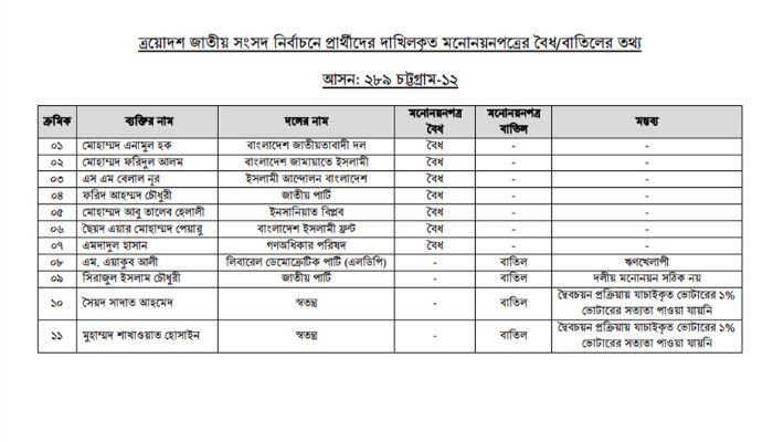 শনিবার (৩ জানুয়ারি) দুপুরে চট্টগ্রাম জেলা প্রশাসক ও রিটার্নিং অফিসারের কার্যালয়ে এই আসনের ১১ জন প্রার্থীর মনোনয়নপত্র যাচাই-বাছাই কার্যক্রম অনুষ্ঠিত হয়। রিটার্নিং কর্মকর্তা ও চট্টগ্রাম জেলা প্রশাসক মোহাম্মদ জাহিদুল ইসলাম মিয়া যাচাই-বাছাই শেষে এই ঘোষণা দেন।