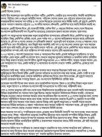 তার নিজস্ব ফেইজবুক একাউন্টে পোস্ট দিয়ে তিনি লিখেন, আমি মীর আরশাদুল হক জাতীয় নাগরিক পার্টির (এনসিপি) কেন্দ্রীয় যুগ্ম সদস্যসচিব, নির্বাহী কাউন্সিলের সদস্য, মিডিয়া সেল ও শৃঙ্খলা কমিটির সদস্য, পরিবেশ সেলের প্রধান এবং চট্টগ্রাম মহানগরের প্রধান সমন্বয়কারীসহ অন্যান্য সব দায়িত্ব ও পদ থেকে নিজেকে প্রত্যাহার করে নিচ্ছি৷ আমি এই মুহূর্তে এনসিপি থেকে পদত্যাগ করলাম। চট্টগ্রাম-১৬ সংসদীয় আসনে (বাঁশখালী) এনসিপির হয়ে আমি নির্বাচন করছি না।