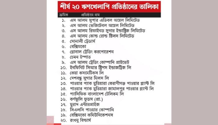 তালিকায় আরও রয়েছে প্যাসিফিক বাংলাদেশ টেলিকম, কর্ণফুলী ফুডস, মুরাদ এন্টারপ্রাইজ, সিএলসি পাওয়ার কোম্পানি, বেক্সিমকো কমিউনিকেশন্স এবং রংধনু বিল্ডার্সসহ মোট ২০টি প্রতিষ্ঠান।
