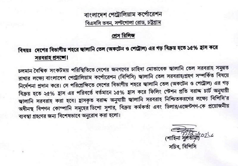 বিজ্ঞপ্তিতে আরও বলা হয়, হ্রাসকৃত বরাদ্দ অনুযায়ী জ্বালানি সরবরাহ নিশ্চিত করতে বিপিসির অধীনস্থ বিপণন কোম্পানিগুলোর ডিপো সুপার, বিক্রয় কর্মকর্তা এবং ডিলার ও এজেন্টদের প্রয়োজনীয় ব্যবস্থা গ্রহণের জন্য বিশেষভাবে অনুরোধ জানানো হয়েছে।