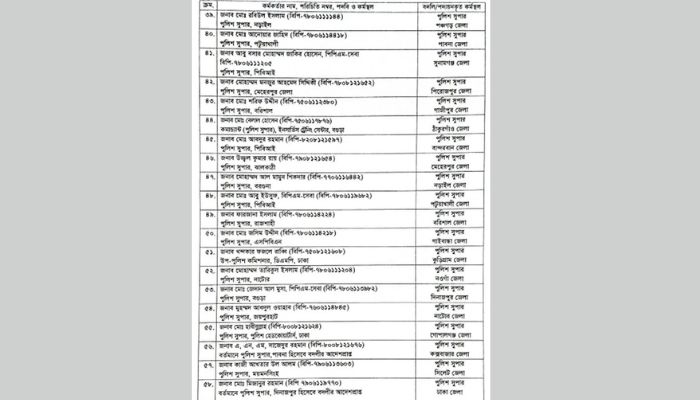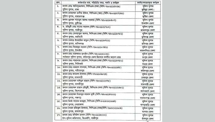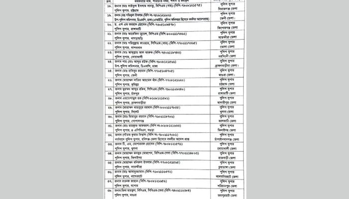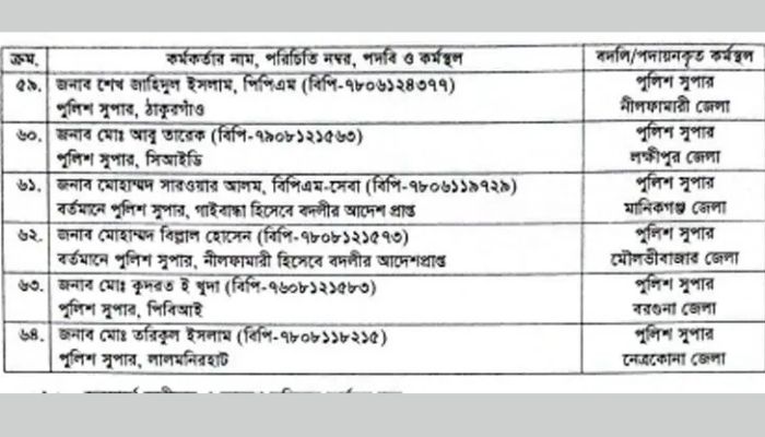 সূত্রটি আরও জানায়, নতুন এই তালিকায় বর্তমানে দায়িত্বে থাকা ৫০ জেলার পুলিশ সুপারকে বহাল রাখা হলেও তাদের ভিন্ন জেলায় বদলি করা হয়েছে। এছাড়া ১৪টি জেলা থেকে বিদ্যমান পুলিশ সুপারদের প্রত্যাহার করা হয়েছে এবং তাদের স্থলাভিষিক্ত হিসেবে ১৪ জন নতুন কর্মকর্তাকে তালিকায় যুক্ত করা হয়েছে। নতুন নিয়োগপ্রাপ্তদের মধ্যে ৪ জন বিসিএস ২৫তম ব্যাচের এবং বাকি ১০ জন ২৭তম ব্যাচের কর্মকর্তা।