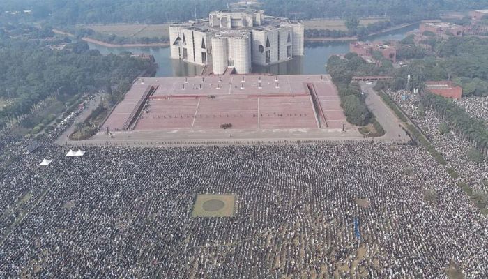 জাতীয় সংসদ ভবনের ভেতরের মাঠ, বাইরের অংশ, মানিক মিয়া অ্যাভিনিউ ও আশপাশের এলাকাজুড়ে লাখ লাখ মানুষ জানাজায় অংশ নেন। নির্ধারিত স্থানে জায়গা না পেয়ে হাজার হাজার মানুষ বিভিন্ন সড়কে দাঁড়িয়ে জানাজার নামাজ আদায় করেন।
