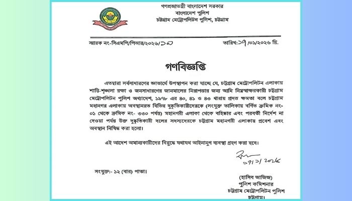 গণবিজ্ঞপ্তিতে বলা হয়, চট্টগ্রাম মেট্রোপলিটন পুলিশ অধ্যাদেশ, ১৯৭৮-এর ৪০, ৪১ ও ৪৩ ধারায় প্রদত্ত ক্ষমতাবলে এ সিদ্ধান্ত গ্রহণ করা হয়েছে। সিদ্ধান্ত অনুযায়ী, সংযুক্ত তালিকায় উল্লেখিত ক্রমিক নম্বর ০১ থেকে ৩৩০ পর্যন্ত মোট ৩৩০ জন দুষ্কৃতিকারীকে চট্টগ্রাম মহানগর এলাকা থেকে বহিষ্কার করা হয়েছে। একই সঙ্গে পরবর্তী নির্দেশ না দেওয়া পর্যন্ত তাদের মহানগরীতে প্রবেশ ও অবস্থান সম্পূর্ণভাবে নিষিদ্ধ থাকবে।