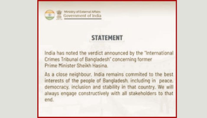 বিবৃতিতে বলা হয়েছে, ‘বাংলাদেশের আন্তর্জাতিক অপরাধ ট্রাইব্যুনাল কর্তৃক সাবেক প্রধানমন্ত্রী শেখ হাসিনার বিরুদ্ধে ঘোষিত রায় নিয়ে ভারত অবগত। ঘনিষ্ঠ প্রতিবেশী দেশ হিসেবে বাংলাদেশের জনগণের শান্তি, গণতন্ত্র, অন্তর্ভুক্তি ও স্থিতিশীলতাসহ সর্বোত্তম স্বার্থের প্রতি ভারত প্রতিশ্রুতিবদ্ধ। এই উদ্দেশ্যে আমরা সব পক্ষের সঙ্গে গঠনমূলকভাবে কাজ করে যাব।’