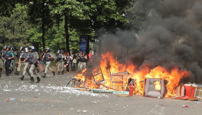 এ সময় পুলিশের কয়েকটি গাড়ি ভাঙচুরের ঘটনা ঘটে। পাশাপাশি এমপি হোস্টেলের সামনের সড়কে আগুন জ্বালিয়ে বিক্ষোভ করছেন আন্দোলনকারীরা।