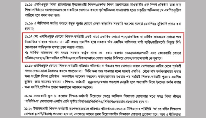 নীতিমালার ১১.১৭-এর ‘ক’ ধারায় বলা হয়েছে, এমপিওভুক্ত কোনো শিক্ষক-কর্মচারী একই সঙ্গে একাধিক কোনো পদে/চাকরিতে বা আর্থিক লাভজনক কোনো পদে নিয়োজিত থাকতে পারবে না। এটি তদন্তে প্রমাণিত হলে সরকার তার এমপিও বাতিলসহ দায়ী ব্যক্তি/ব্যক্তিবর্গের বিরুদ্ধে বিধি মোতাবেক শাস্তিমূলক ব্যবস্থা গ্রহণ করতে পারবে।