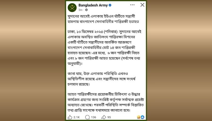 ওই পোস্টে বলা হয়, সুদানের আবেই-তে আজ শনিবার (১৩ ডিসেম্বর ২০২৫) সন্ত্রাসী কর্তৃক ইউ এন ঘাঁটি আক্রমণে বাংলাদেশ সেনাবাহিনীর ৬ জন শান্তিরক্ষী নিহত, ৮ জন আহত। সেখানে যুদ্ধ এখনও চলমান রয়েছে বলেও জানানো হয়েছে।