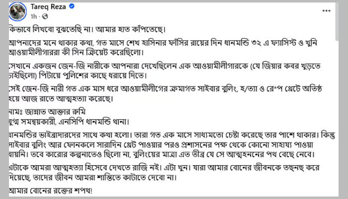 তারেক রেজা তার ফেসবুক পোস্টে লিখেছেন, কিভাবে লিখব বুঝছি না। আমার হাত কাঁপছে। আপনাদের মনে থাকার কথা, গত মাসে শেখ হাসিনার ফাঁসির রায়ের দিন ধানমণ্ডি ৩২-এ ফ্যাসিস্ট ও খুনি আওয়ামী লীগাররা কী সিন ক্রিয়েট করেছিল। সেখানে একজন জেন-জি নারীকে আপনারা দেখেছিলেন, এক আওয়ামী লীগারকে (যে জিয়ার কবর খুড়তে চাইছিল) পিটায়ে পুলিশের কাছে ধরায়ে দিতে।